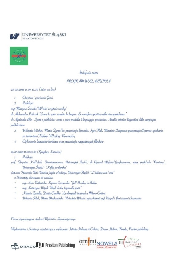 23 i 24 .03 uczniowie z klas 1c, 2a, 3e uczestniczyli w zajęciach z języka włoskiego - Italofonia 2026. W pierwszym dniu były prelekcje online a w kolejnym dniu w Spinplace UŚ w Katowicach.