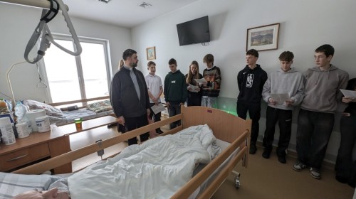Natomiast 8 stycznia 2026 r. uczniowie 1D, 1B i 2C z ks. Grzegorzem i p. Jonaszem udali się do Hospicjum im. Św. Jana Pawła II w Bielsku-Białej. Tym razem nasi młodzi Artyści zaprezentowali jasełka Pracownikom, Wolontariuszom oraz Podopiecznym na oddziale stacjonarnym w Hospicjum. Przedstawienie było wyrazem wrażliwości, empatii i chęci niesienia radości innym.