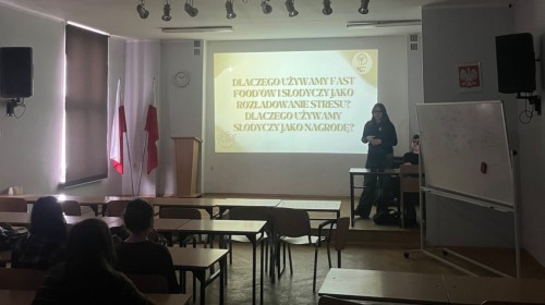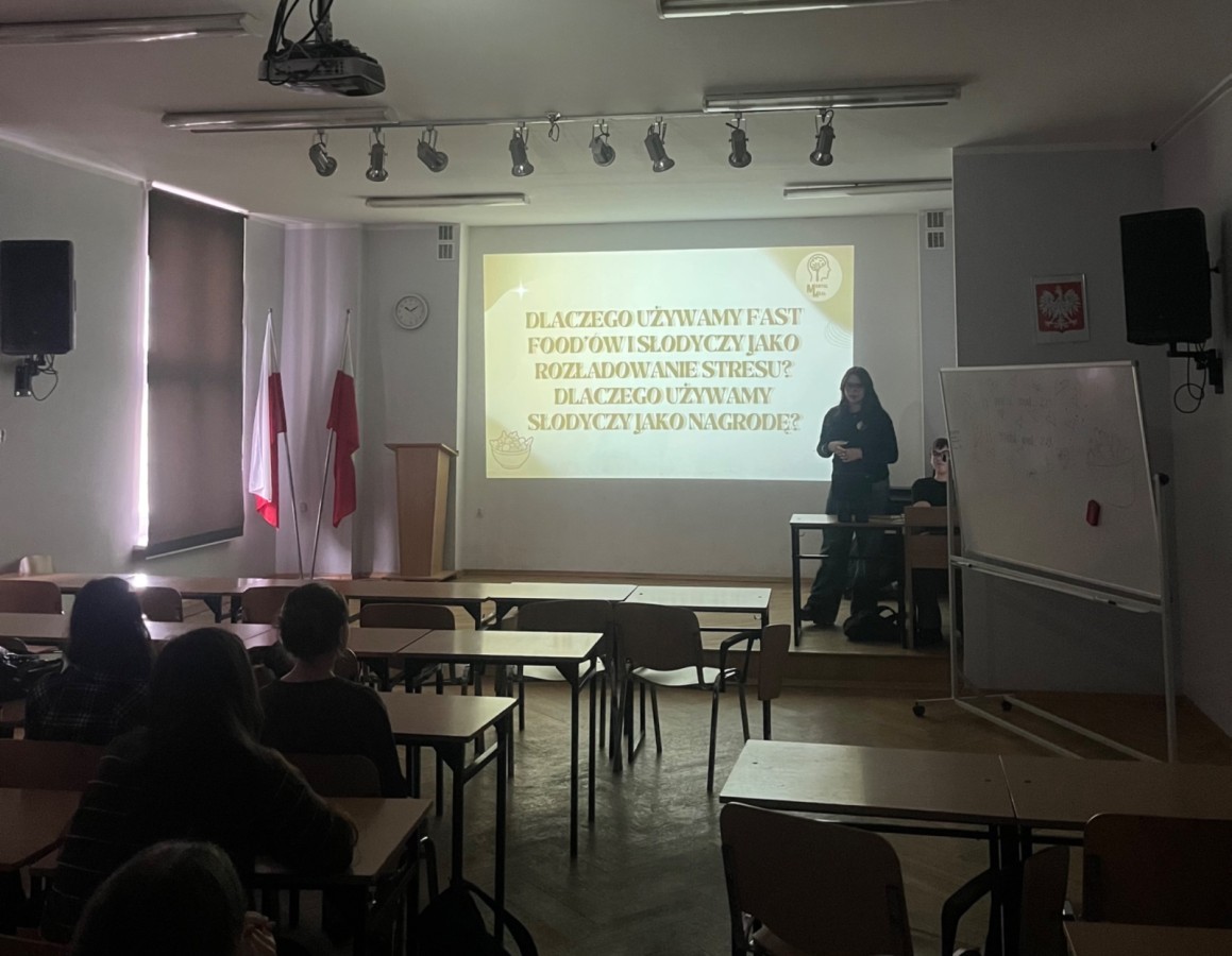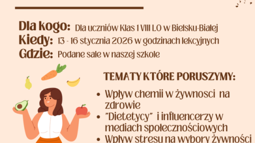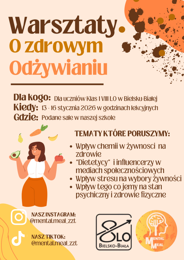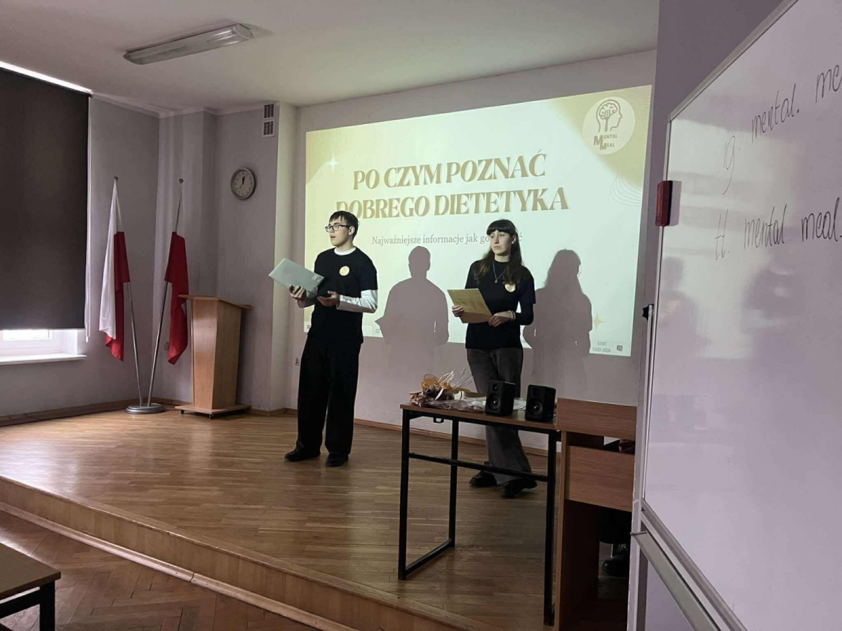 W dniach od 13 do 16 stycznia w naszej szkole odbyły się warsztaty dotyczące zdrowego odżywiania poprowadzone przez zespół Mental Meal - uczniów klasy 2B i 2C realizujących projekt Zwolnieni z Teorii zajmujący się tematem wpływu odżywiania na zdrowie psychiczne oraz fizyczne. W warsztatach brały udział klasy 1A, 1B, 1C, 1E oraz klasa 2B. Mogli pogłębić swoją wiedzę na temat wpływu mediów społecznościowych na nasze wybory żywieniowe, emocjonalnego jedzenia oraz chemii w żywności, a zdobytą wiedzę pokazali na debacie oksfordzkiej za które zdobyli nagrody.