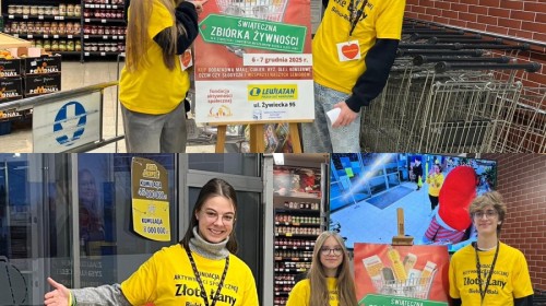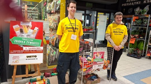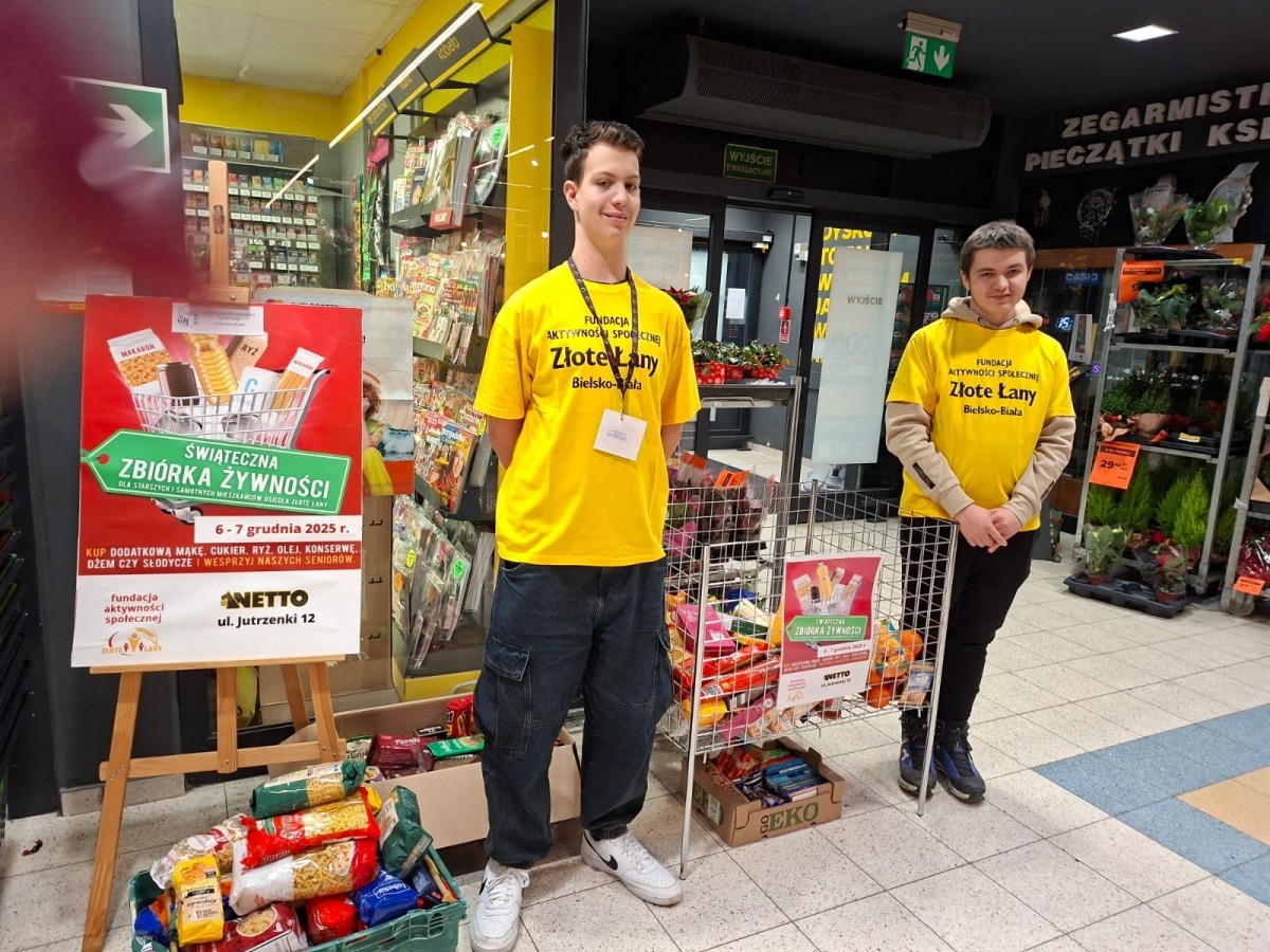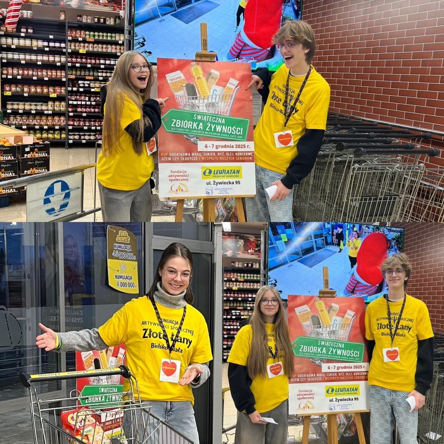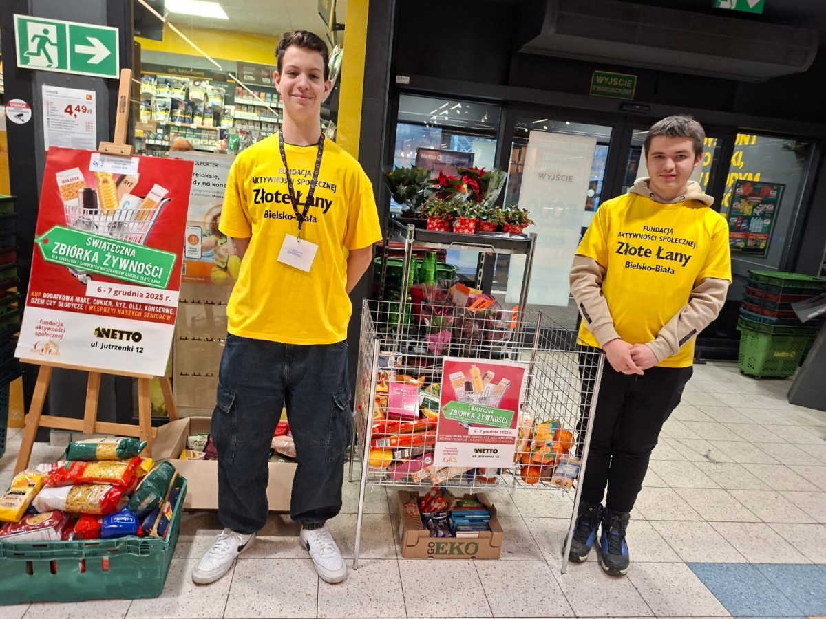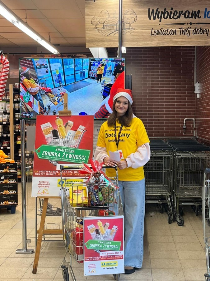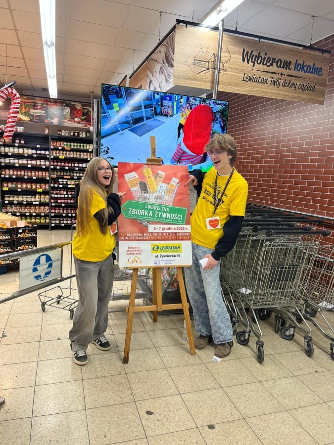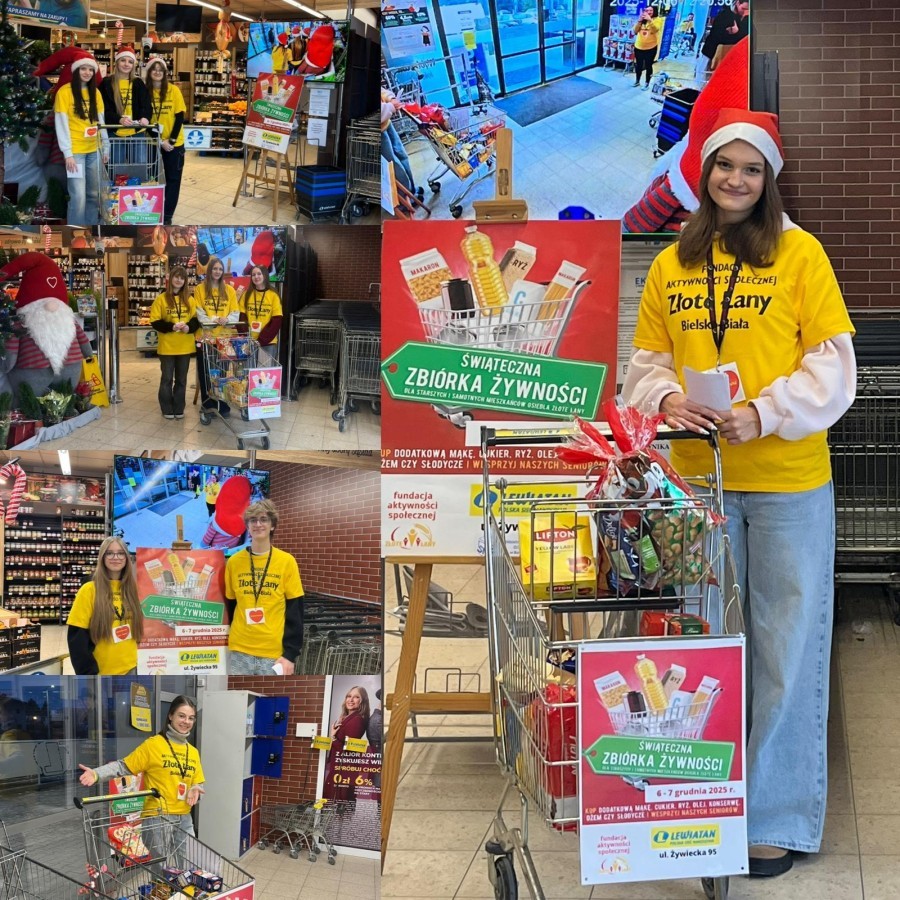 6 i 7 grudnia grupa wolontariuszy z naszej szkoły wzięła udział w Świątecznej Zbiórce Żywności, zorganizowanej przez Fundację Aktywności Społecznej oraz Spółdzielnię Mieszkaniową Złote Łany. Dzięki ogromnemu zaangażowaniu uczniów i mieszkańców udało się zebrać około 900 kg różnorodnych artykułów spożywczych – zarówno produktów pierwszej potrzeby, jak i tych o wyjątkowym, świątecznym charakterze. Zebrane dary pozwolą na przygotowanie około 150 paczek, które trafią do najbardziej potrzebujących seniorów z osiedla Złote Łany. Zbiórka odbywała się w osiedlowych placówkach: Netto przy ul. Jutrzenki 12 i Lewiatan przy ul. Żywieckiej 95