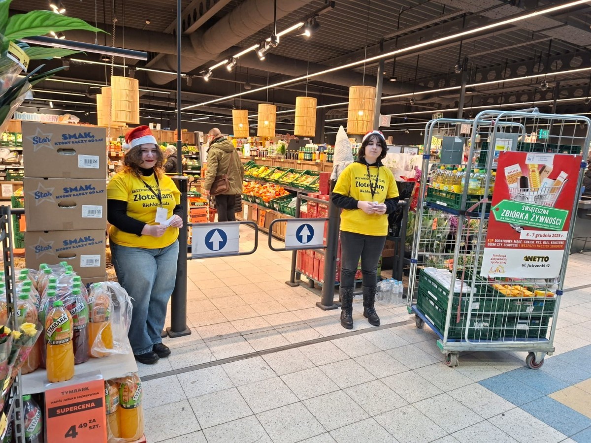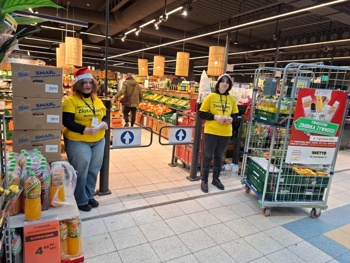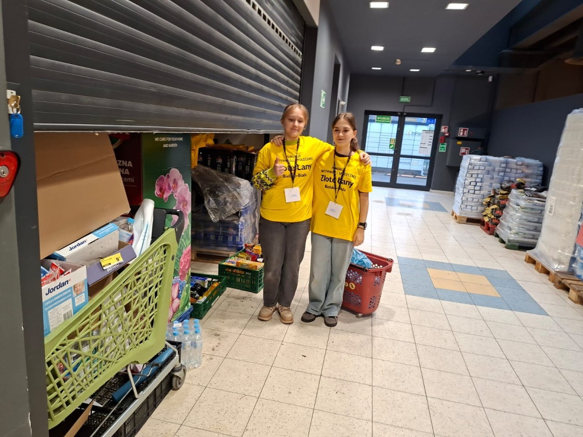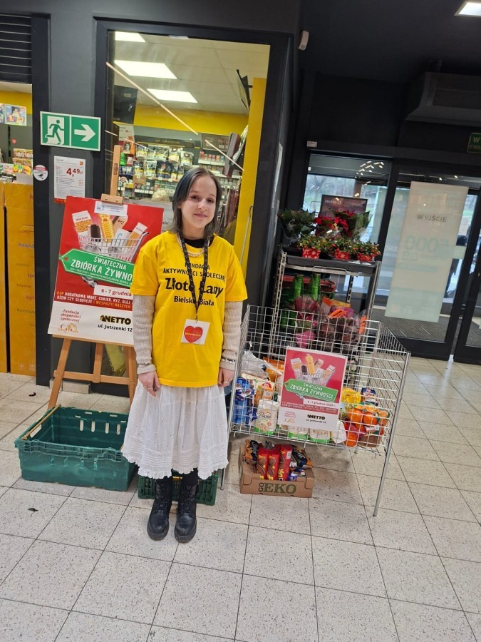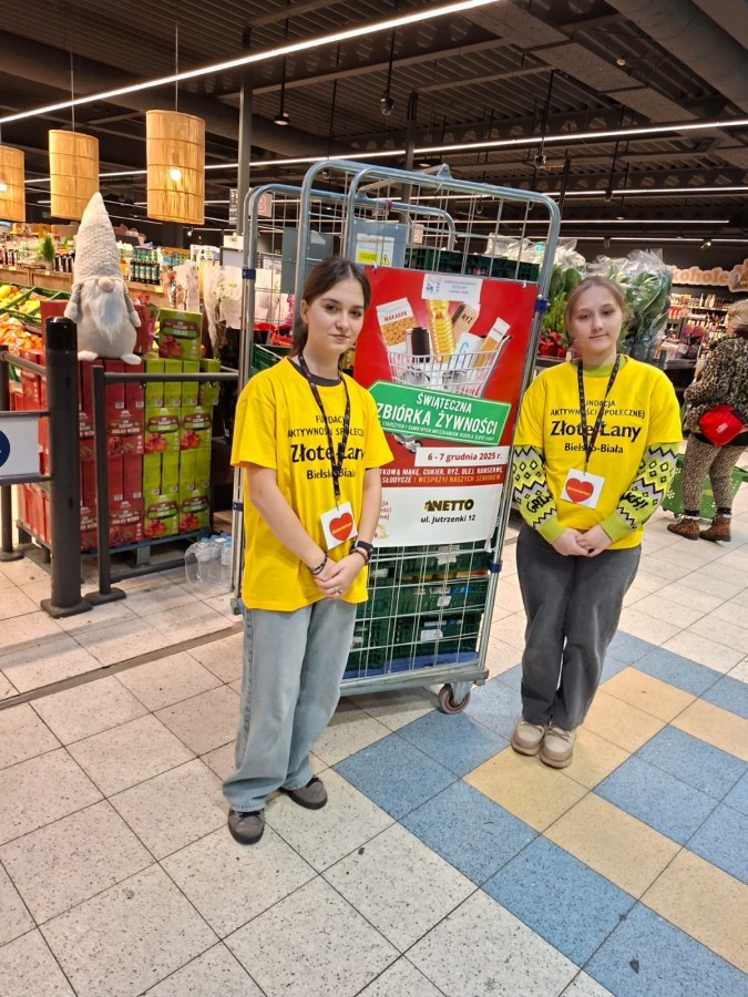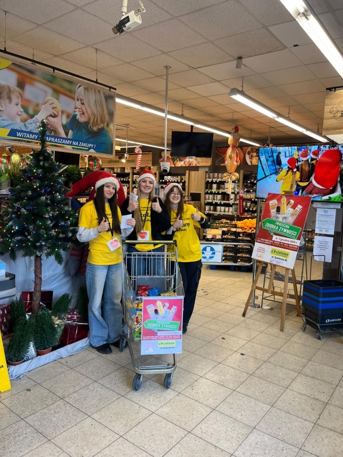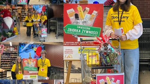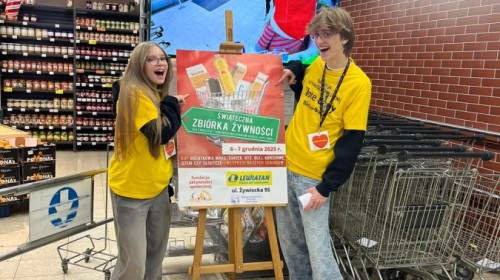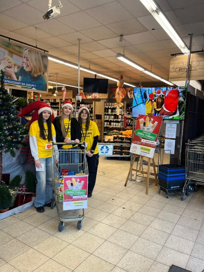 6 i 7 grudnia grupa wolontariuszy z naszej szkoły wzięła udział w Świątecznej Zbiórce Żywności, zorganizowanej przez Fundację Aktywności Społecznej oraz Spółdzielnię Mieszkaniową Złote Łany. Dzięki ogromnemu zaangażowaniu uczniów i mieszkańców udało się zebrać około 900 kg różnorodnych artykułów spożywczych – zarówno produktów pierwszej potrzeby, jak i tych o wyjątkowym, świątecznym charakterze. Zebrane dary pozwolą na przygotowanie około 150 paczek, które trafią do najbardziej potrzebujących seniorów z osiedla Złote Łany. Zbiórka odbywała się w osiedlowych placówkach: Netto przy ul. Jutrzenki 12 i Lewiatan przy ul. Żywieckiej 95